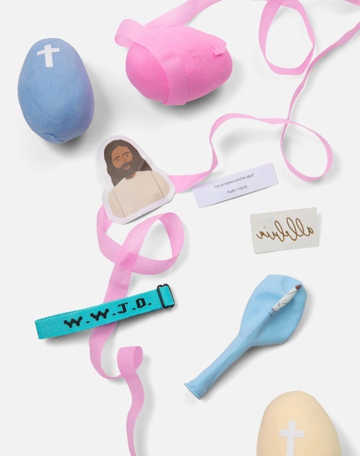 Inside each egg has (1) Bible verse, (1) alleluia gold temporary tattoo, (1) waterproof Jesus sticker, (1) latex balloon with an image of the risen Jesus and the words «He is Risen», and (1) WWJD bracelet in various colors.