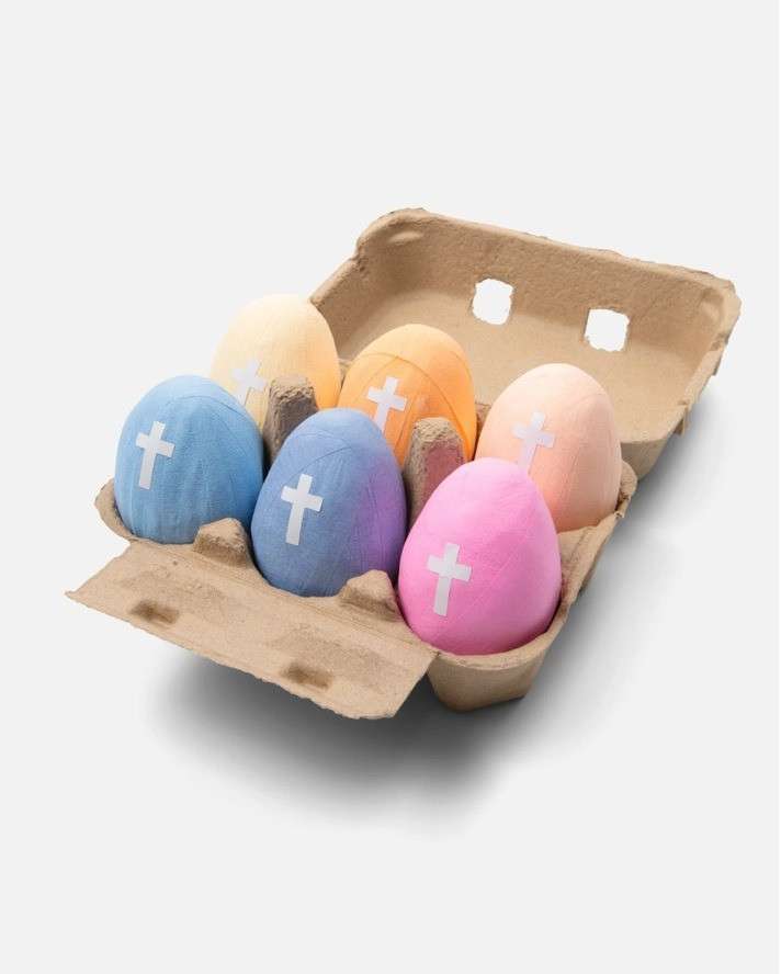 Each carton contains 6 surprise eggs. They are marked with a simple white cross.