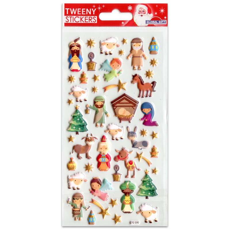 Små, tykke klistremerker med julekrybbe. Til å dekorer pakker, kort osv.