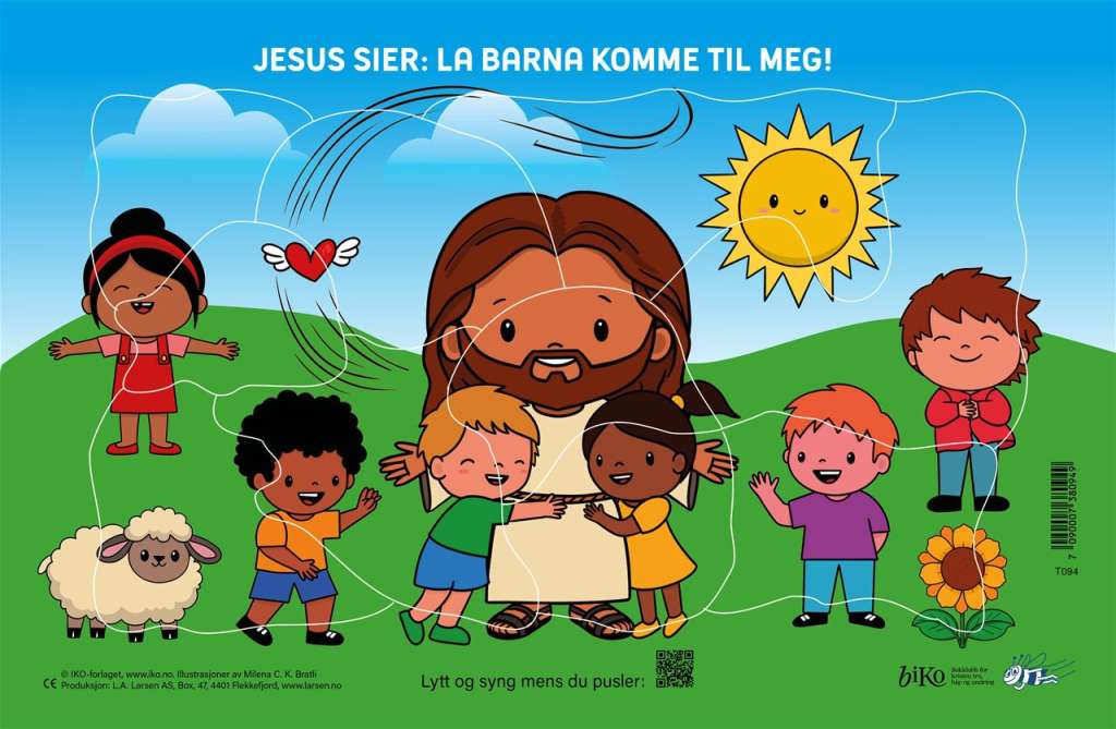 Puslespill med illustrasjon knyttet til den kjente bibelteksten om Jesus og barna.