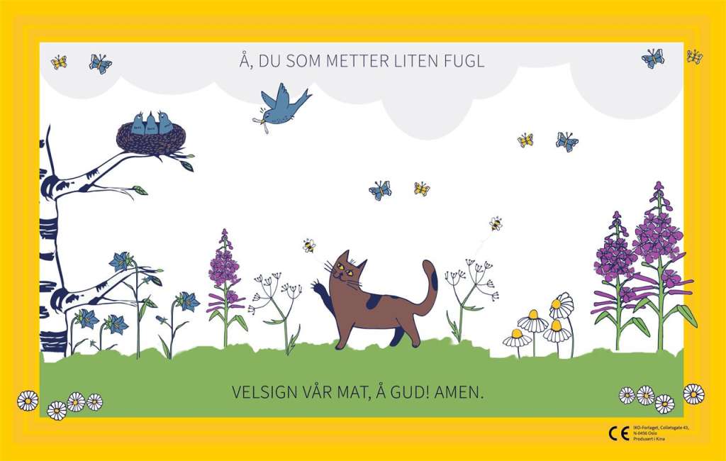 Spisebrikke med bordverset «Å, du som metter liten fugl». Størrelse: 43 x 28 cm.